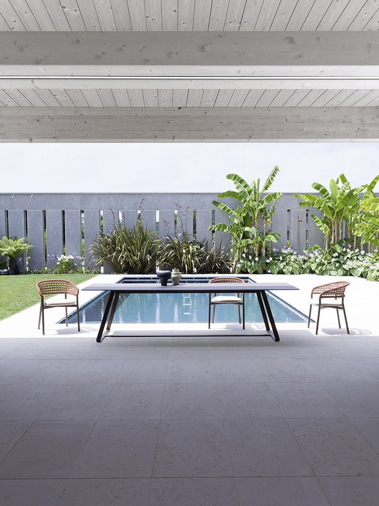 Das besonders Designorientierte Gestell von Kolonaki aus gezogenem Stahlprofil kennzeichnet diesen Tisch mit seinen weichen und eleganten Linien, die einer robusten und optisch leichten Struktur Form verleihen. Die Kataphorese-Schutzbehandlung macht den Stahl besonders widerstandsfähig gegen Korrosion durch atmosphärische Einflüsse, insbesondere in Seegebieten. Kolonaki ist ein raffinierter Vorschlag, der jeden Außenbereich von der Veranda des Hausgartens bis zur Terrasse eines Restaurants verbessert.