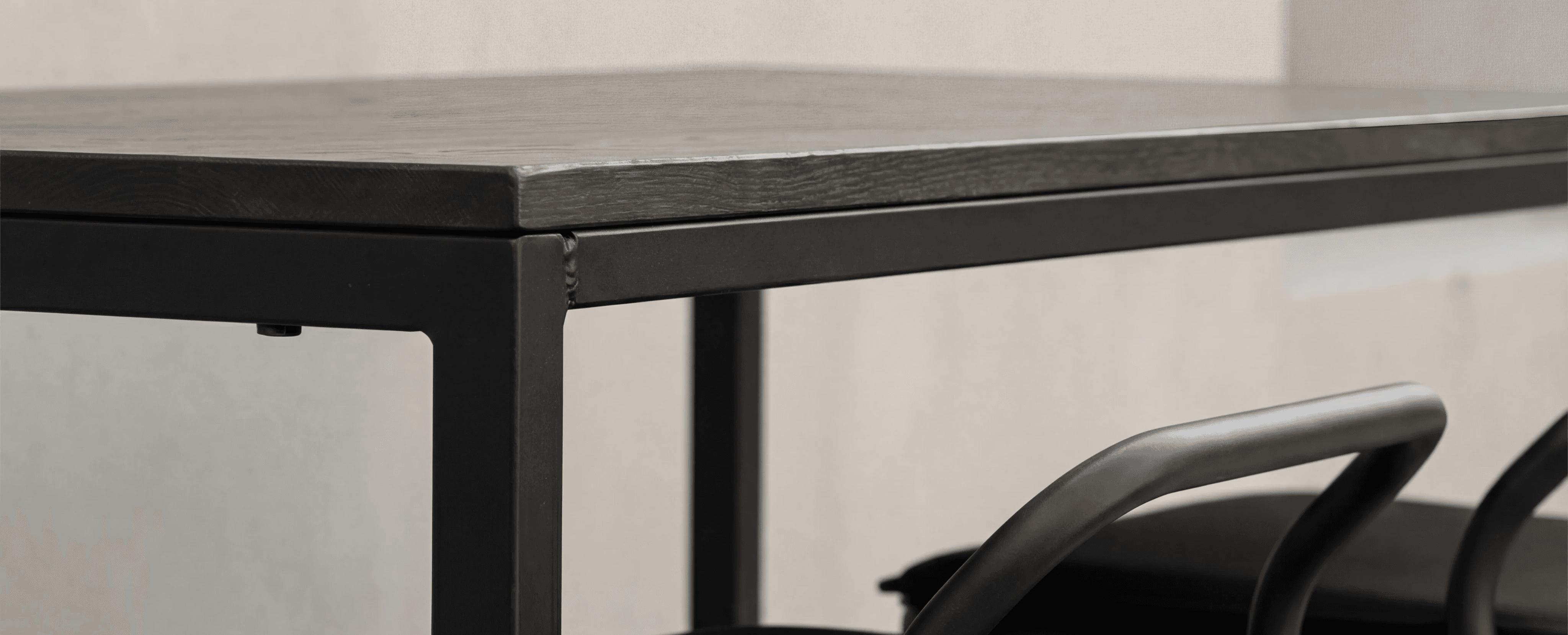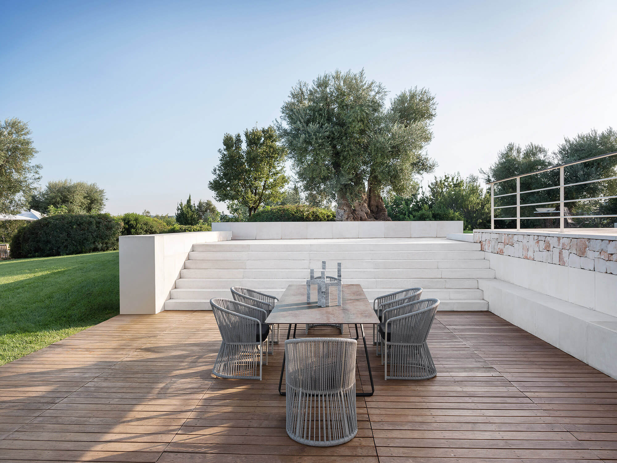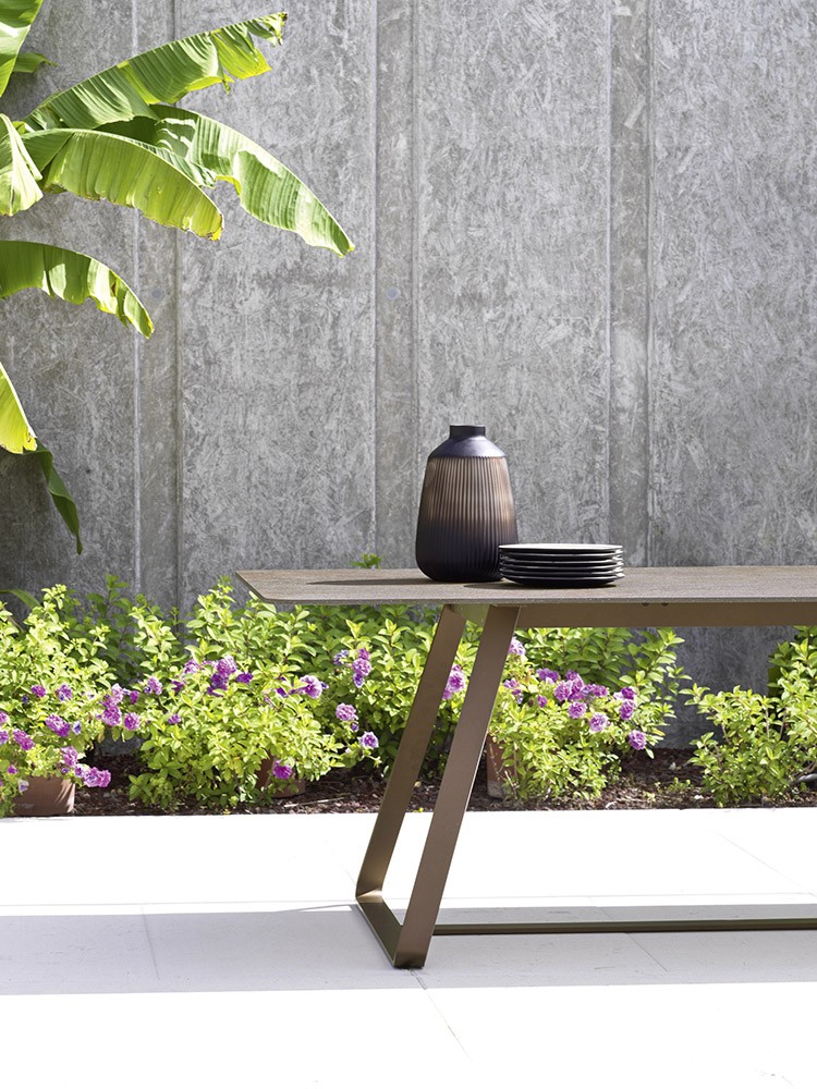 Gestell aus gezogenem Stahlprofil, mit C5M-Schutzbehandlung und pulverlackierung um in Meeresnähe eingesetzt zu werden, Ablage in HPL oder Keramik. Witterungs- und UV-beständig.