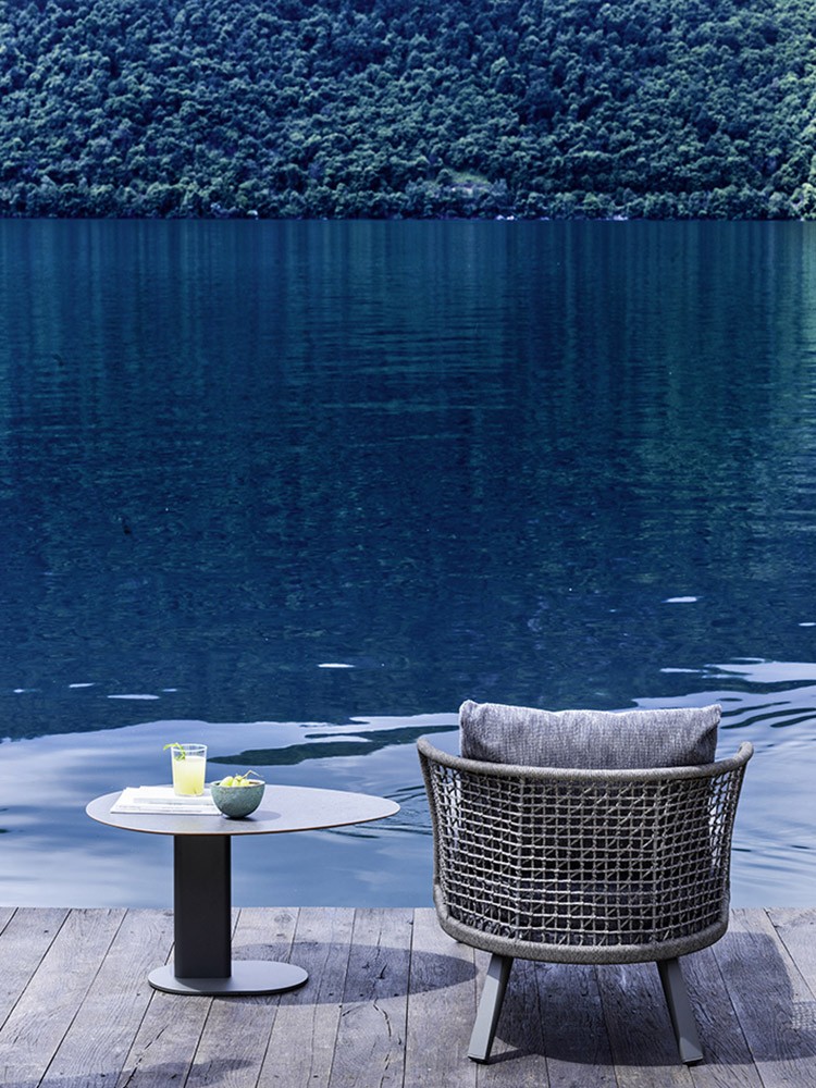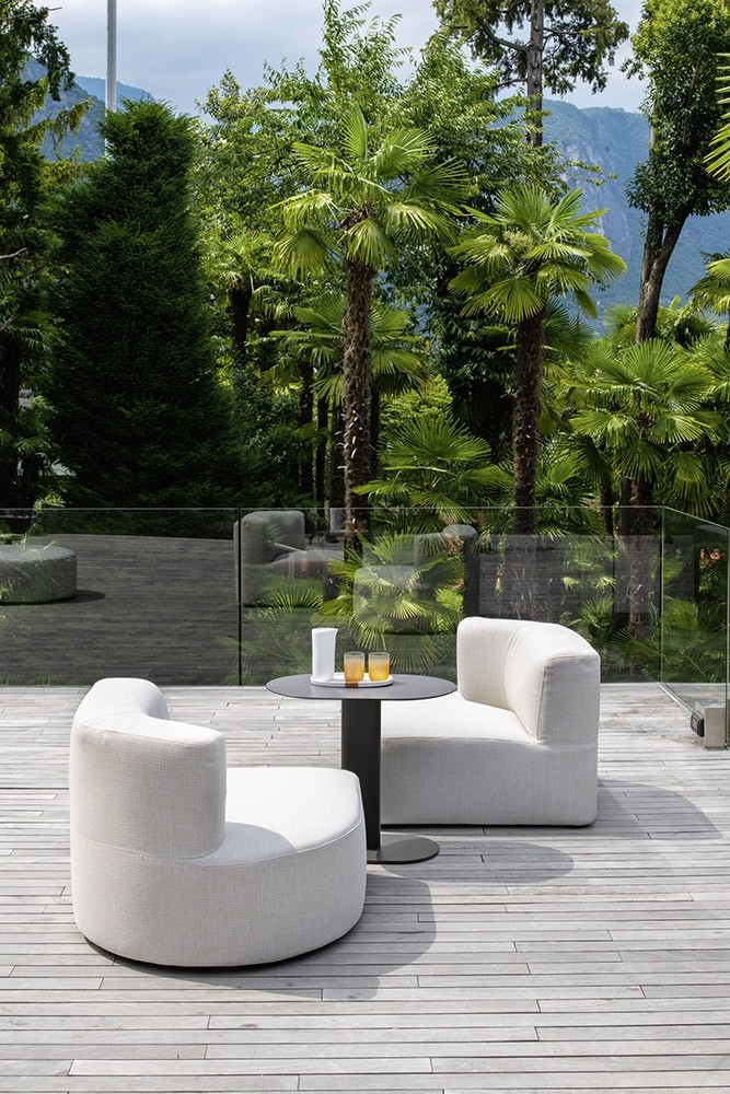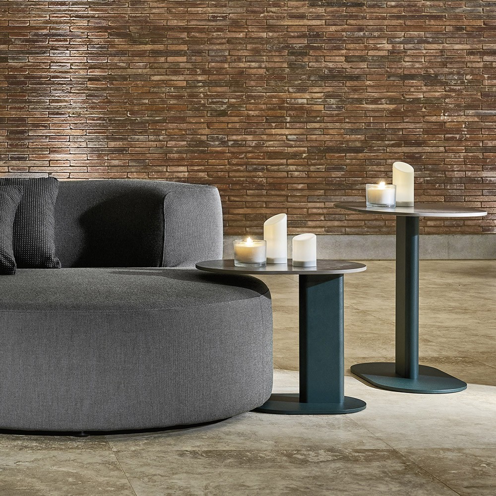 Der Plinto-Beistelltisch bietet eine praktische Ablage für das Abstellen von kleineren Gegenstände, die Sie möglicherweise benötigen, wenn Sie Zeit im Freien verbringen. Der Holm mit dem elliptischen Querschnitt, der die gesamte Kollektion kennzeichnet, definiert auch diese für den Außenbereich konzipierte Version. Das Oberteil und das Unterteil haben ebenfalls eine elliptische Form, eine ästhetische Wahl, die dem Design dieser Möbel Harmonie verleiht. Der Plinto-Beistelltisch eignet sich perfekt in Kombination mit einem modularen Sofa oder einem Sessel und eignet sich sowohl für Wohn- als auch für HoReCa-Umgebungen.