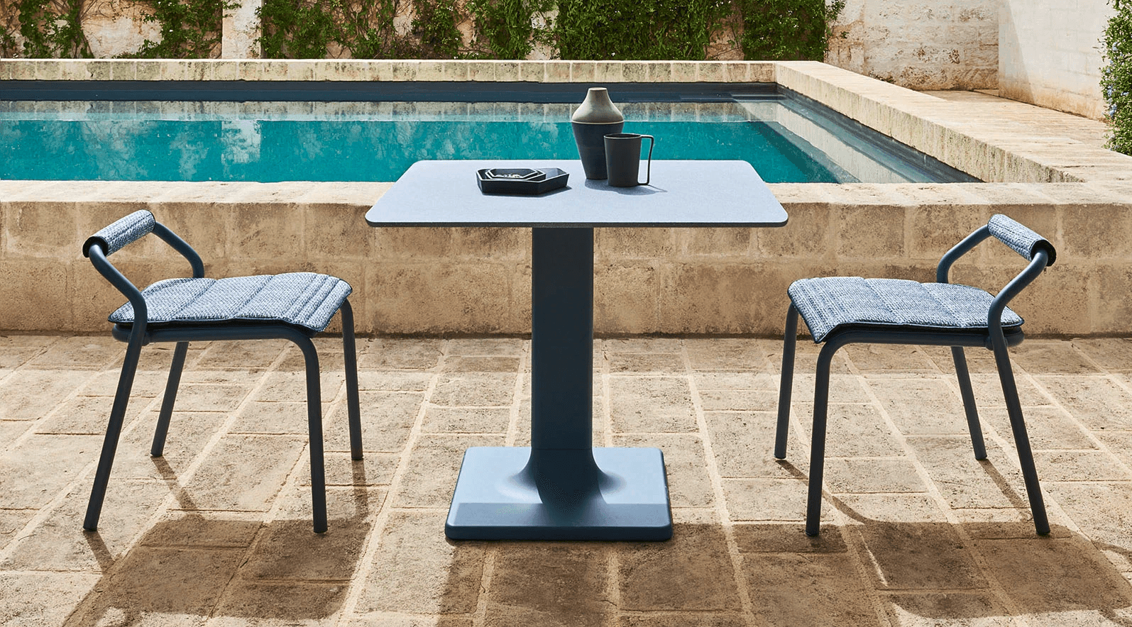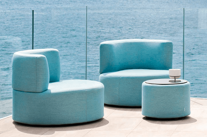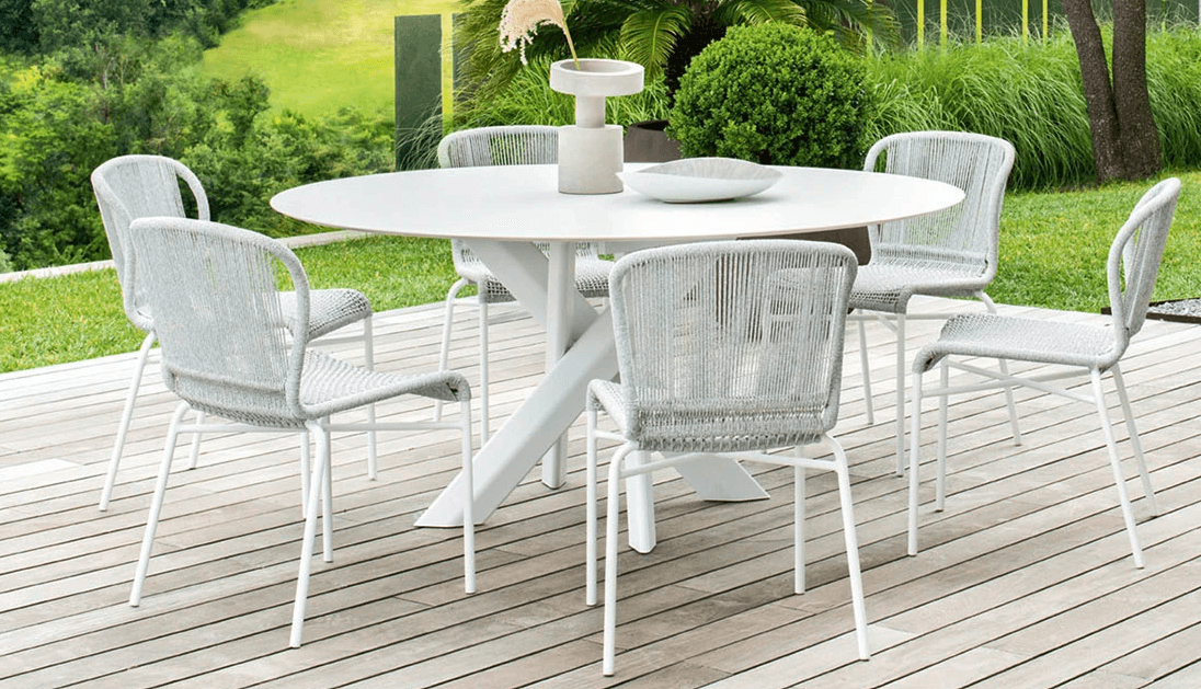 Gestell in lackiertem Aluminium, umflochten in Handarbeit mit einer Kordel aus Kunstfaser. Die abziehbaren Kissen sind gepolstert mit offenporigem Dryfeel® Outdoorschaum. Witterungs- und (UV) Sonnenlichtbeständig.