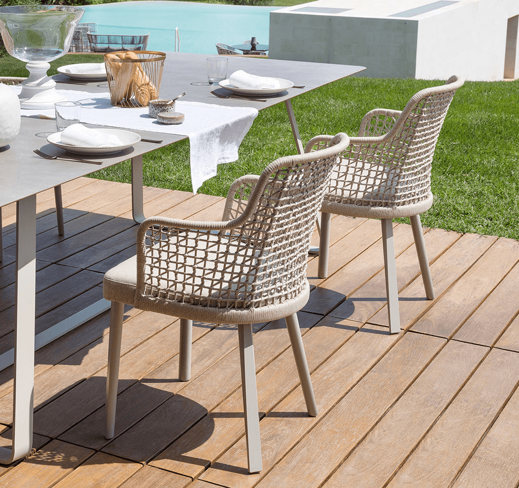 Gestell in lackiertem Aluminium, umflochten in Handarbeit mit einer Kordel aus Kunstfaser. Die abziehbaren Kissen sind gepolstert mit offenporigem Dryfeel® Outdoorschaum. Witterungs- und (UV) Sonnenlichtbeständig.